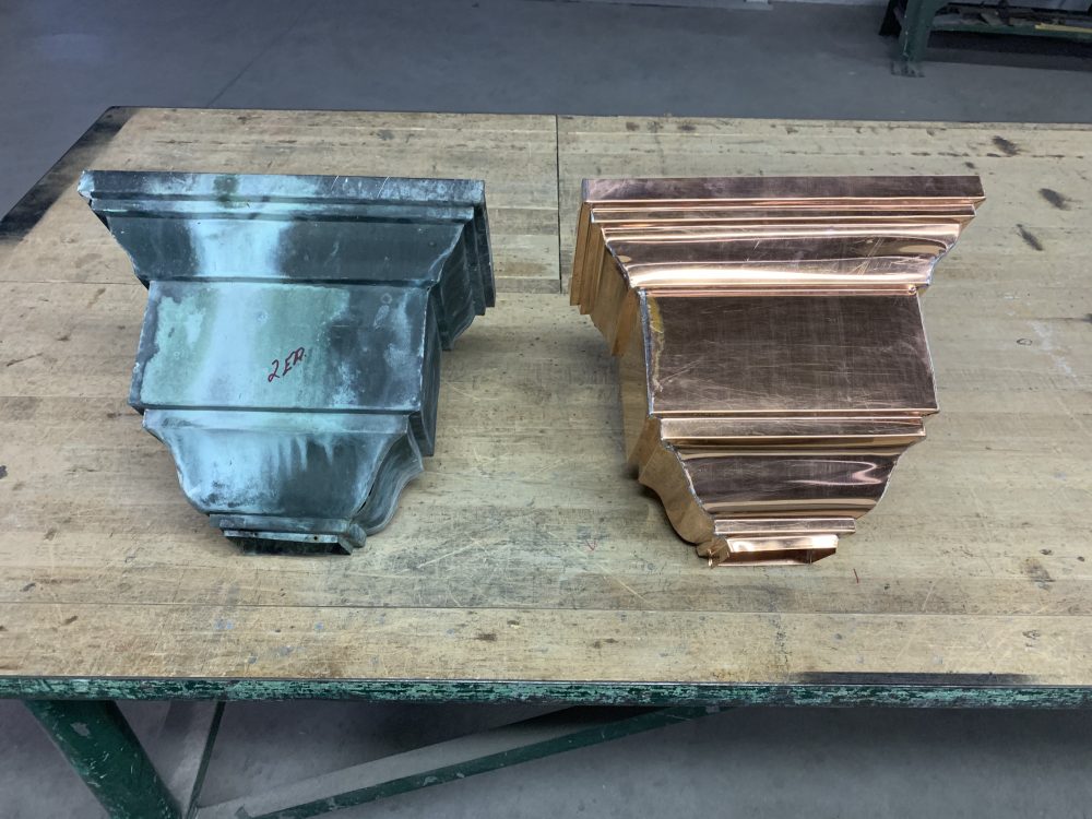 With the new slate roof came new metal flashings, trim and gutters. Combining the skills of GSM Roofing and GSM Industrial we were able to custom fabricate all of the metal needed for this project. We used Revere copper in Freedom Gray for all of the exposed metal. This is a sheet of copper that is treated with an alloy of tin/zinc on the outside layer, combining the strength and reliability of copper with the aesthetic required for this historical property. We replaced all of the copper gutters and downspouts with copper hinged leak guards. The snow rail brackets were fabricated in our shop using 1” x 3/16 stainless steel bar, and the rails were made of IPE Brazilian Mahogany. We installed a custom roof hatch clad with Freedom Gray copper. GSM Industrial fabricated and welded stainless steel frames for the chimney caps that were then also covered with Freedom Gray copper.